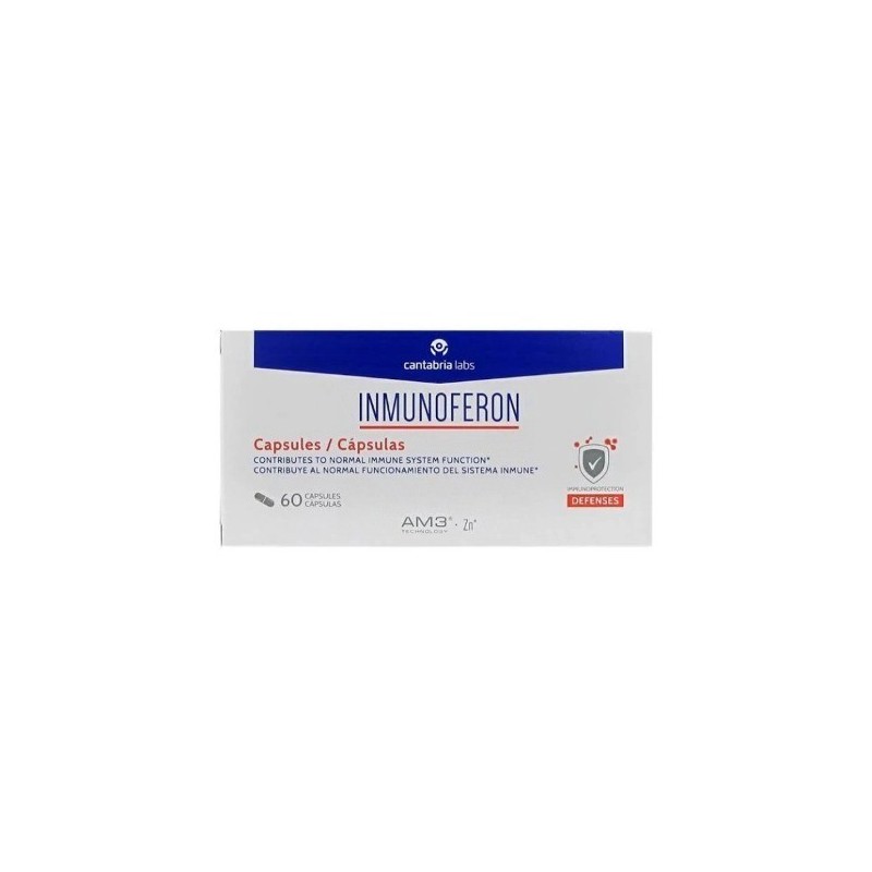 INMUNOFERON es un complemento alimenticio con una fórmula exclusiva a base de AM3® (alfa glucomanano fosforilado y proteína de soja), tecnología patentada por Cantabria Labs, y zinc, ingrediente que contribuye al normal funcionamiento del sistema inmune.